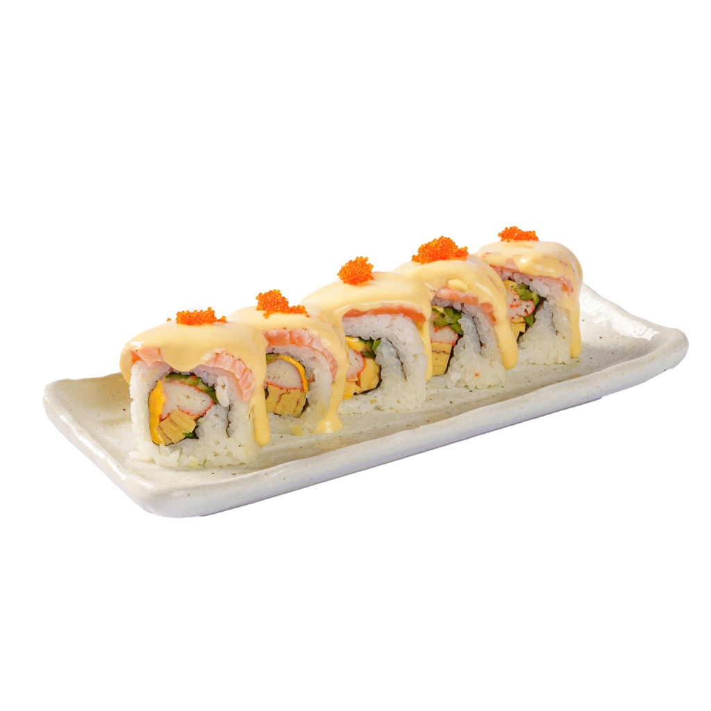 Cá hồi, Phô mai, Tobiko xanh, Thanh cua, Trứng ngọt, Gạo nhật, Nori, Dưa leo, Sốt teri